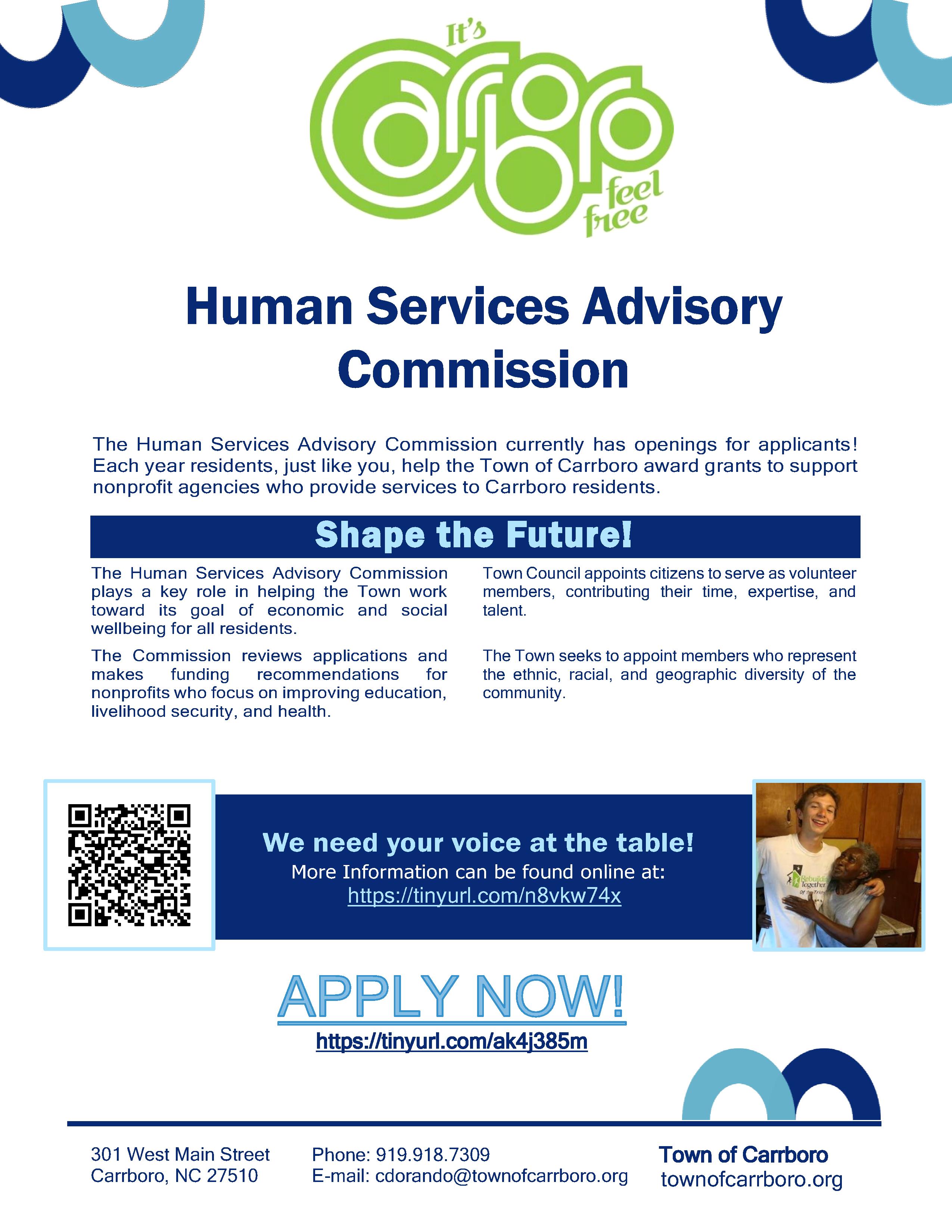 The Town of Carrboro Human Services Advisory Commission http://townofcarrboro.org/292/Human-Services is seeking new members.